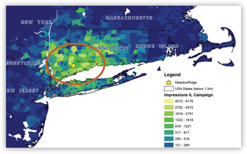 To achieve these goals, EVR focused on making outreach and media targeting more precise and efficient. By moving from broad radius outreach to neighborhood-level targeting revealed through geospatial analysis, we created a more focused approach. Layering in CRM insights, home values and population data helped Meadow Ridge reach households most aligned with their ideal residents. The strategy analyzed the previous year’s impression saturation alongside: